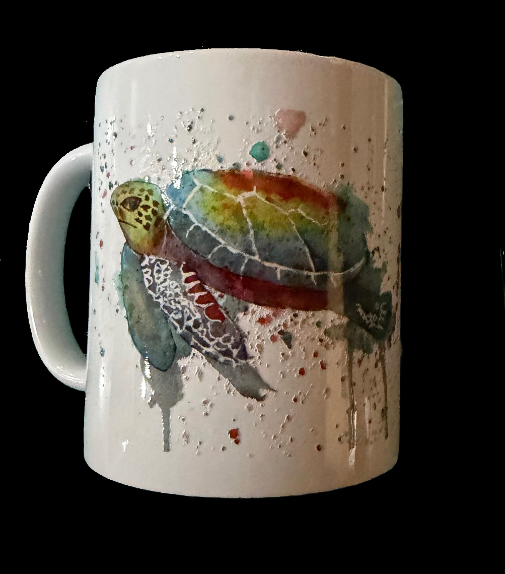 This decorative ceramic mug is practical yet beautiful!  The applied artwork has texture to it. You can choose to have the Do No Evil whimsical birds or Toby the Turtle design applied.